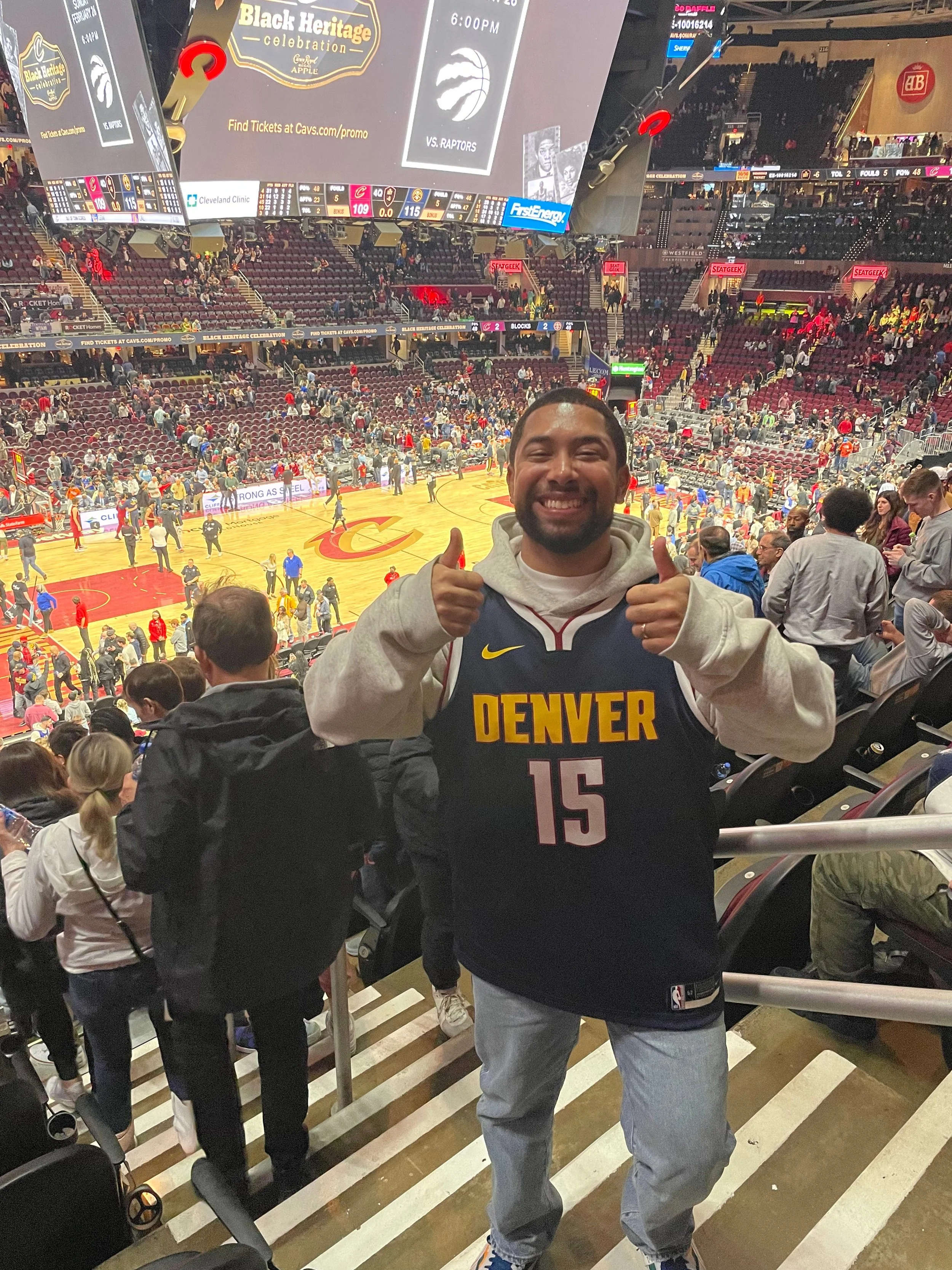 When I moved to Columbus, Ohio, to be closer to Elizabeth, Cleveland became the nearest city for me to see the Nuggets in person. Games are limited because the Nuggets and the Cavs play in different conferences. So although they usually play each other twice a season, the Nuggets only play in Cleveland once a year. And I wanted to be there whenever the Nuggets were in town, so it became an annual tradition for Elizabeth and me to travel to Cleveland for the game. One of our most bizarre memories is seeing the Nuggets play the Cavs on March 7, 2020, one of the last regular season games before the NBA shut down due to COVID-19.